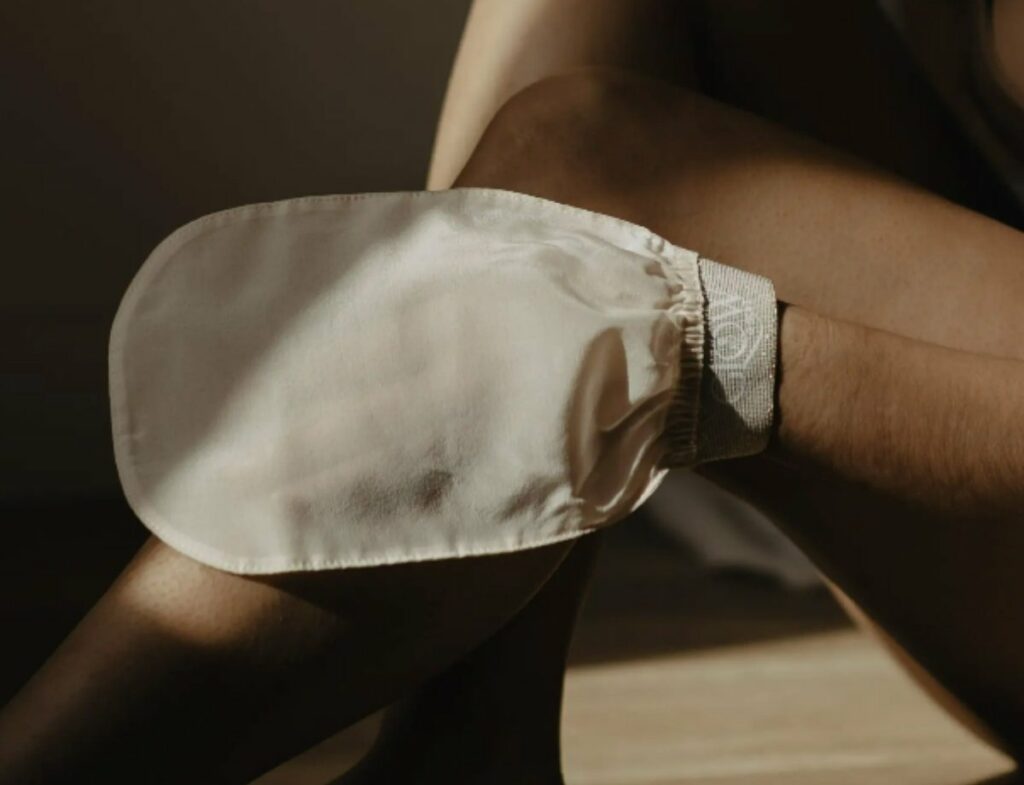 1️⃣ Exfoliez votre corps avec le gant en soie légèrement humide, en mouvements circulaires.